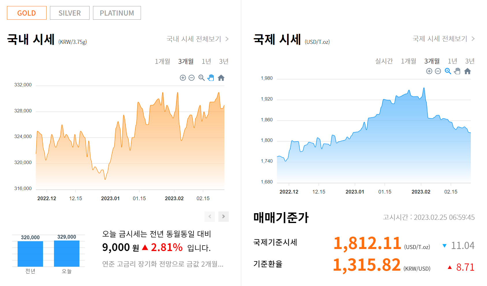금의 국내 시세는 전년도 동월동일과 비교해 볼때 2.81%, 9000원이 올랐습니다.