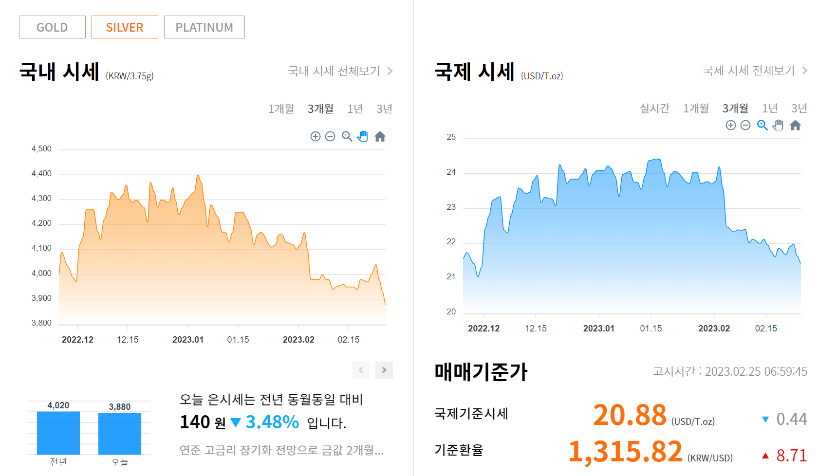 은시세 역시 살때 1.29%(50원) 떨어진 3880원, 팔 때는 1.7%(50) 떨어진 2940원입니다.