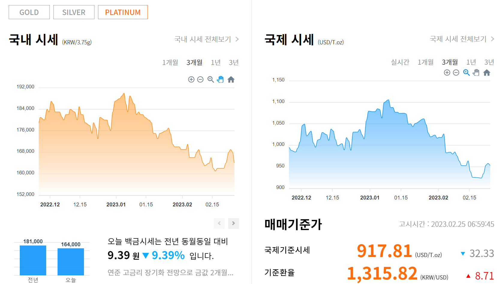 그러나 백금 시세는 살때 기준으로 어제보다 2.44%(4000원) 떨어진 164000원, 팔 때는 3.68$(5000원)가 떨어진 136000원입니다.