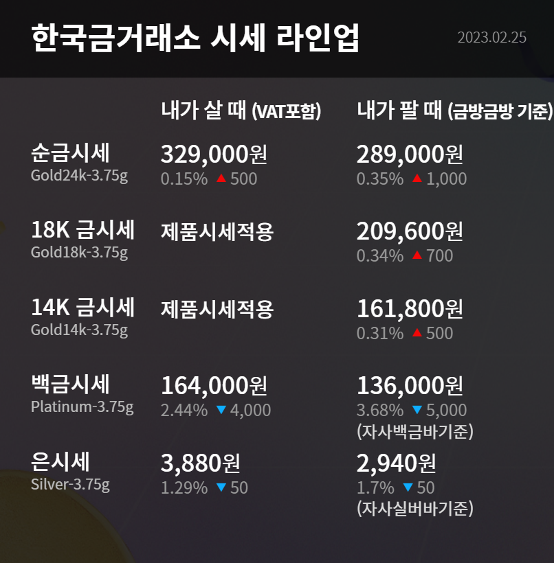 | 금값시세 2023.2.24 골드바 1돈 가격은? (한국금거래소 기준) (0) | 2023.02.24 |