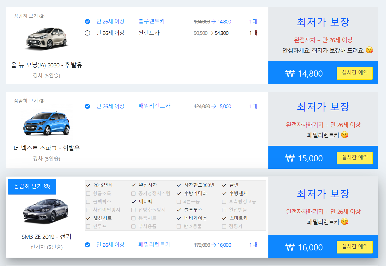 경차부터, 고급 스용차, SUV, 전기차 등 여러 업체의 다양한 렌트카의 가격을 비교해 볼 수 있습니다.