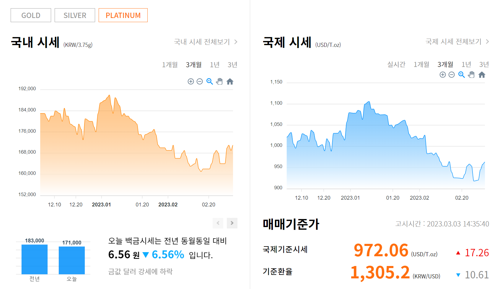 이렇게 매일 금값시세, 은시세 그리고 백금시세를 확인하는 것만으로도 전반적인 추세 예측이 가능하기 때문에 꼭 한 번씩 체크해 보시기 바랍니다.